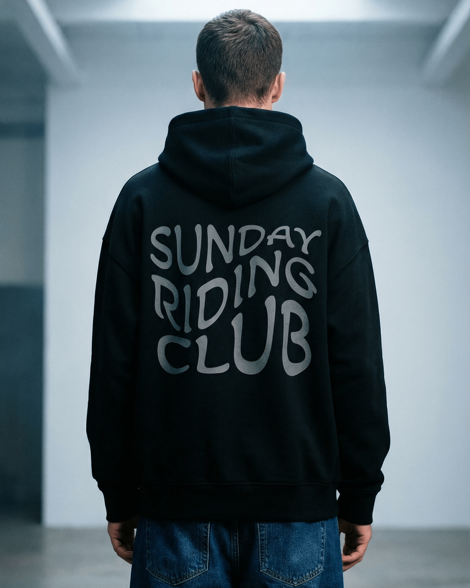 The YES. SUNDAY RIDING CLUB Boxy Hoodie in heavy brushed fleece, made from 83% organic cotton and 17% recycled polyester, with a dry hand feel. It has a boxy, relaxed fit, with dropped shoulders plus chunky and exaggerated ribbing throughout, for enhanced structure. The hoodie features felled shoulder seams, with inside neck tape, and twin needle straddle stitching that runs around all its ribbing. It also has a double shell hood, with heavy cord drawstrings and double shell half moon detail on the inside neck. The kangaroo pocket has a flatlock seam, which also runs over the back of the hood for structure.